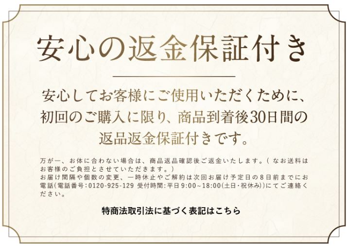 返金保証があるので定期便に申込んだとしても継続の縛りは無く、安心して1か月分を試すことが可能です。